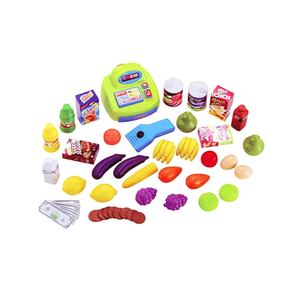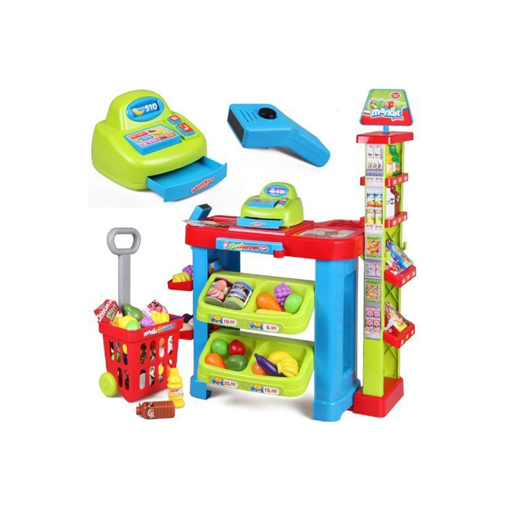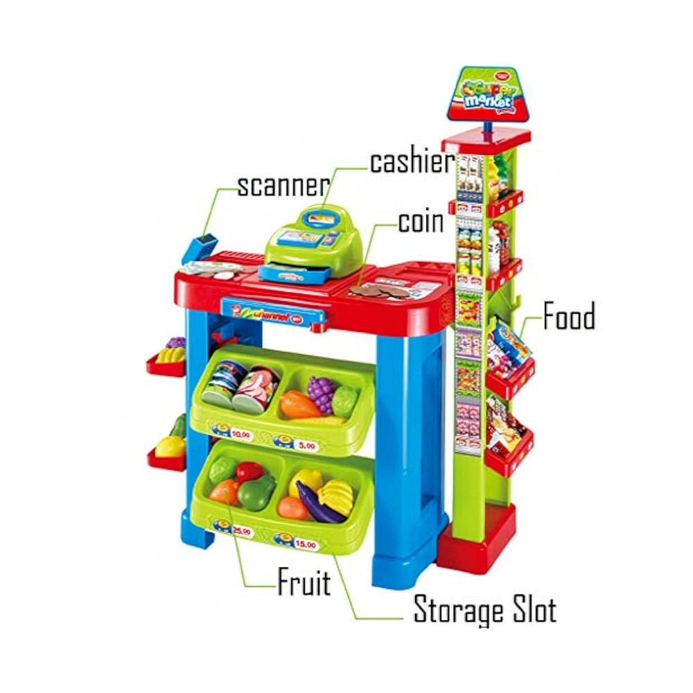 يحتوي على ماكينة كاشير بأضواء وأصوات، ماسح ضوئي، سلة تسوق، خضروات وفواكه بلاستيكية، ورفوف عرض للمنتجات.