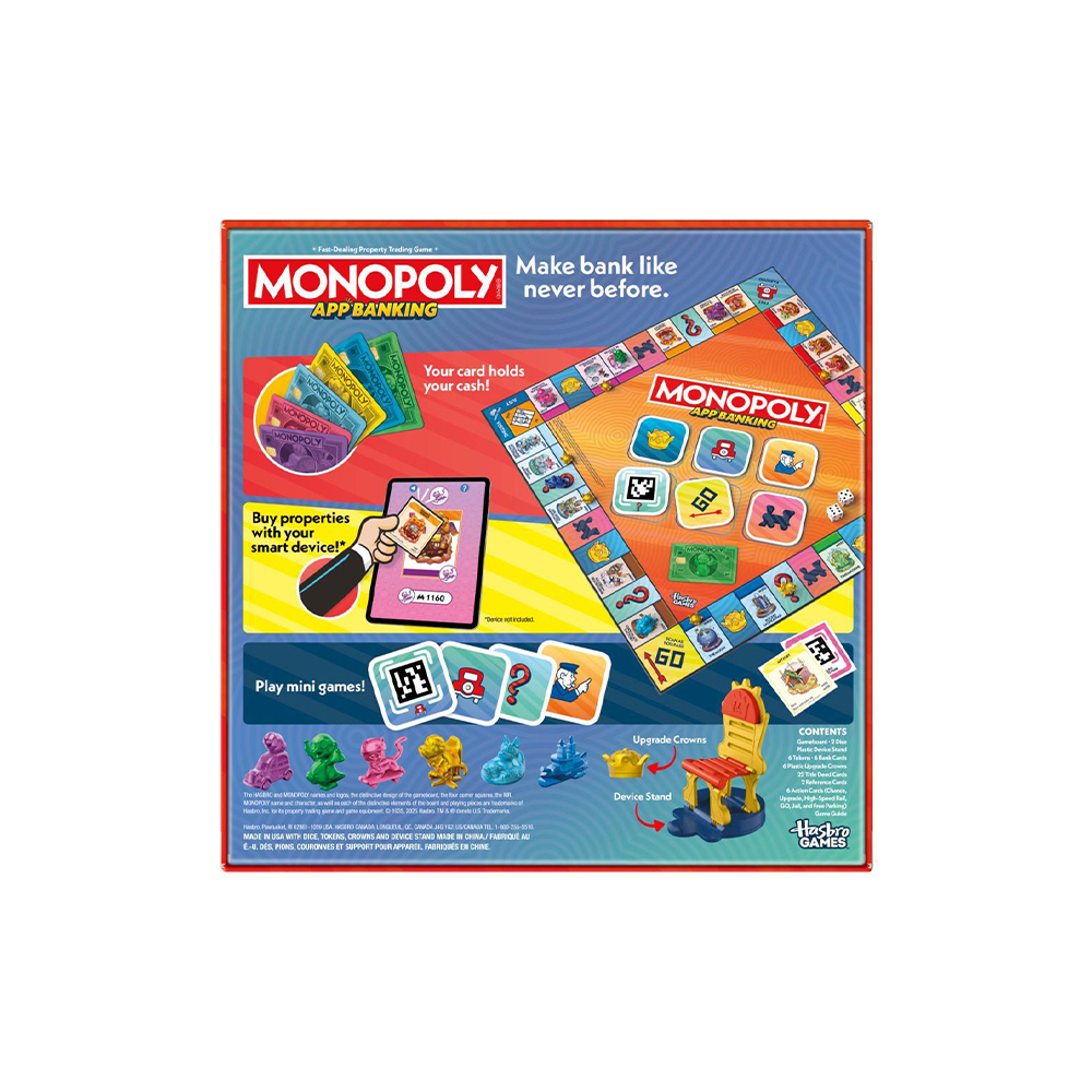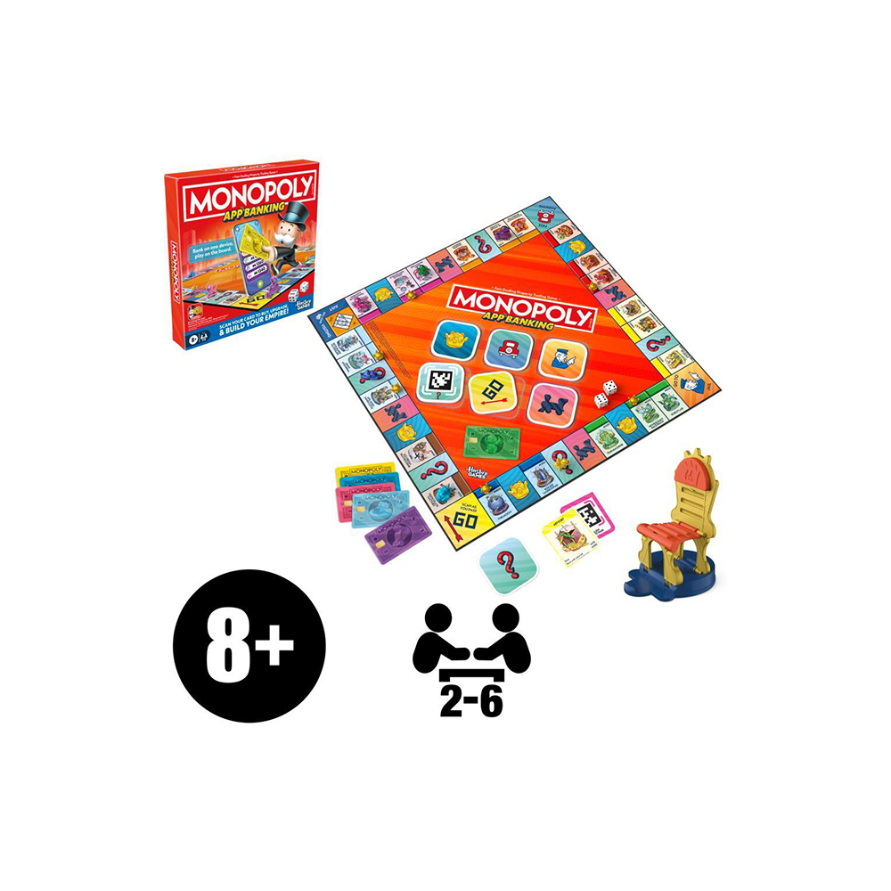 لعبة Monopoly App Banking هي أول لعبة مونوبولي مدعومة بالتطبيق لتسهيل التعاملات والألعاب المصرفية للتزايد! في هذه اللعبة اللوحية سهلة اللعب للأطفال، يستمتع اللاعبون بلعبة مونوبولي الكلاسيكية على اللوحة، ولكن التطبيق هو الشهير والبنك. لا نقود أو عد! ابدأ، قم بتنزيل تطبيق Monopoly App Banking (مجاني للتنزيل – قد داخل تُطبق البيانات وشراء التطبيق) وضع جهاز ذكيًا في المشروع المصاحب. (الجهاز غير مرفق). اختر بطاقة مصرفية ورمزًا حسب ما يناسبك، وسافر عبر لوحة الإعلانات من الطبيعة. امسح صكوك الملكية، ثم اشترِ، واعرض في المزاد، والتحكم في حقوق الملكية باستخدام التطبيق. يمكن أيضًا لعب الألعاب المصغرة للحصول على الامتيازات! لعبة الواقع المعزز للأطفال هي لعبة عائلية ممتعة. أسرع من لعبة مونوبولي الكلاسيكية، وهي رائعة للعب اليومي وليلة العائلية. بسبب ألعاب الأطفال والألعاب العائلية الكبيرة التي تتراوح أعمارهم بين 8 سنوات فما فوق والذين يحبون الخدمات الإلكترونية في مونوبولي وألعاب مونوبولي الأخرى.