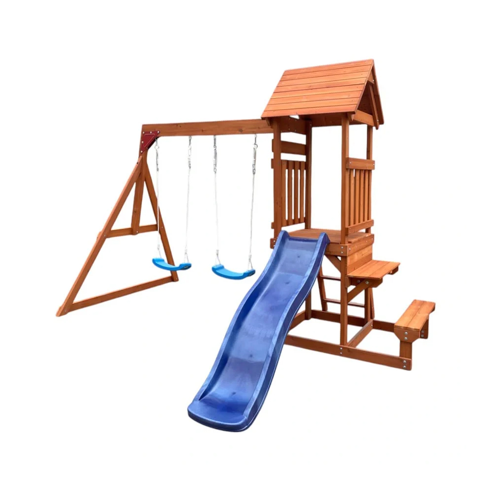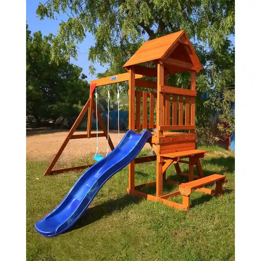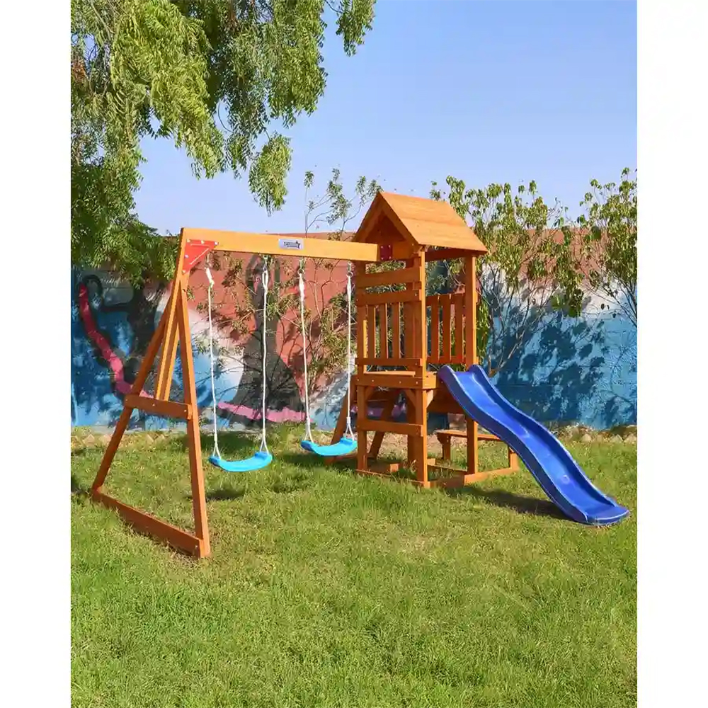 • مميزات جذابة: تتضمن منزلقًا موجيًا عالي السكة، وجدارًا صخريًا متعدد الألوان، وناديًا مظللًا مع قماش مشمع، وصندوق رمل واسع