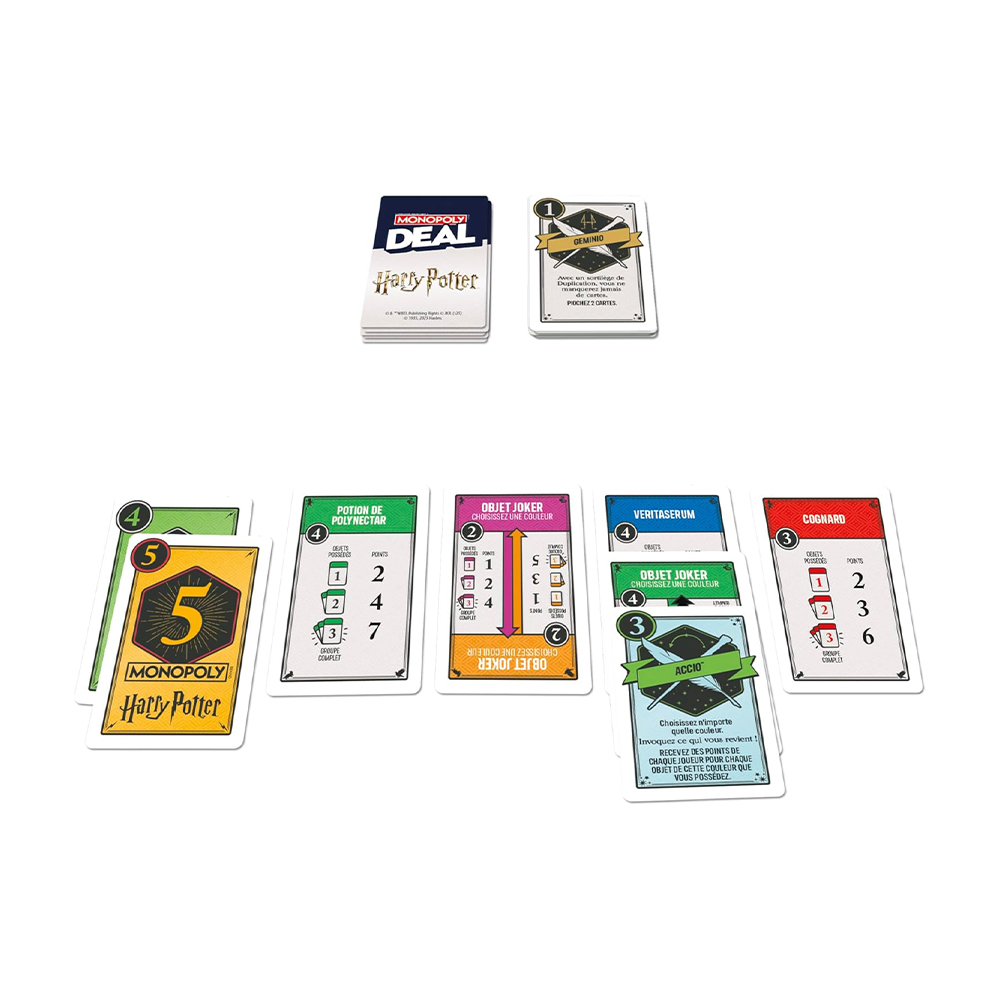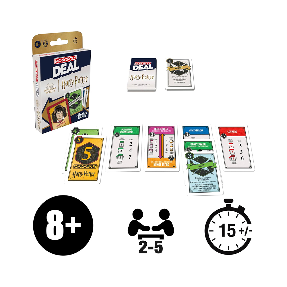 استحضر، اجمع، واربح! في لعبة بطاقات “مونوبولي ديل: هاري بوتر” للأطفال، تنتظرك ثروة من العناصر المسحورة. كن أول ساحر أو ساحر يجمع 3 مجموعات مختلفة من العناصر السحرية للفوز. ألقِ تعاويذ على خصومك لتعطيل خططهم، واحصل على مساعدة من الأبطال والأشرار المشهورين أثناء مبارزتهم للسيطرة على ثروات عالم السحرة! يمكن لعب هذه اللعبة العائلية الممتعة للأطفال والكبار في حوالي 15 دقيقة، لذا فهي مثالية لقضاء وقت ممتع مع العائلة في أي وقت. كما أن ألعاب هاري بوتر تُعد هدايا رائعة للعطلات وأعياد الميلاد للمراهقين والبالغين والأطفال.